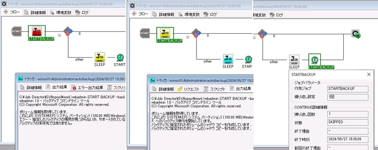 バックアップが失敗したときのトラッカも見てみましょう。画面4は、実行中のジョブネットワークのトラッカをリアルタイムに表示したものです。初回のバックアップを失敗させるため、バックアップ用ドライブをオフラインにした状態でジョブネットワークを開始しました。トラッカは最初のバックアップが失敗したことを示しています(画面4の左)。その後、条件分岐に従って単位ジョブ「SLEEP」で待機します。この間に、バックアップ用ディスクをオンラインに戻します。すると、コンティニュー部品で再び単位ジョブ「STARBACKUP」に戻り、バックアップが始まります(画面4の中央のトラッカ)。バックアップのリトライは成功し、ジョブネットワークが終了します(画面4の右のトラッカ)