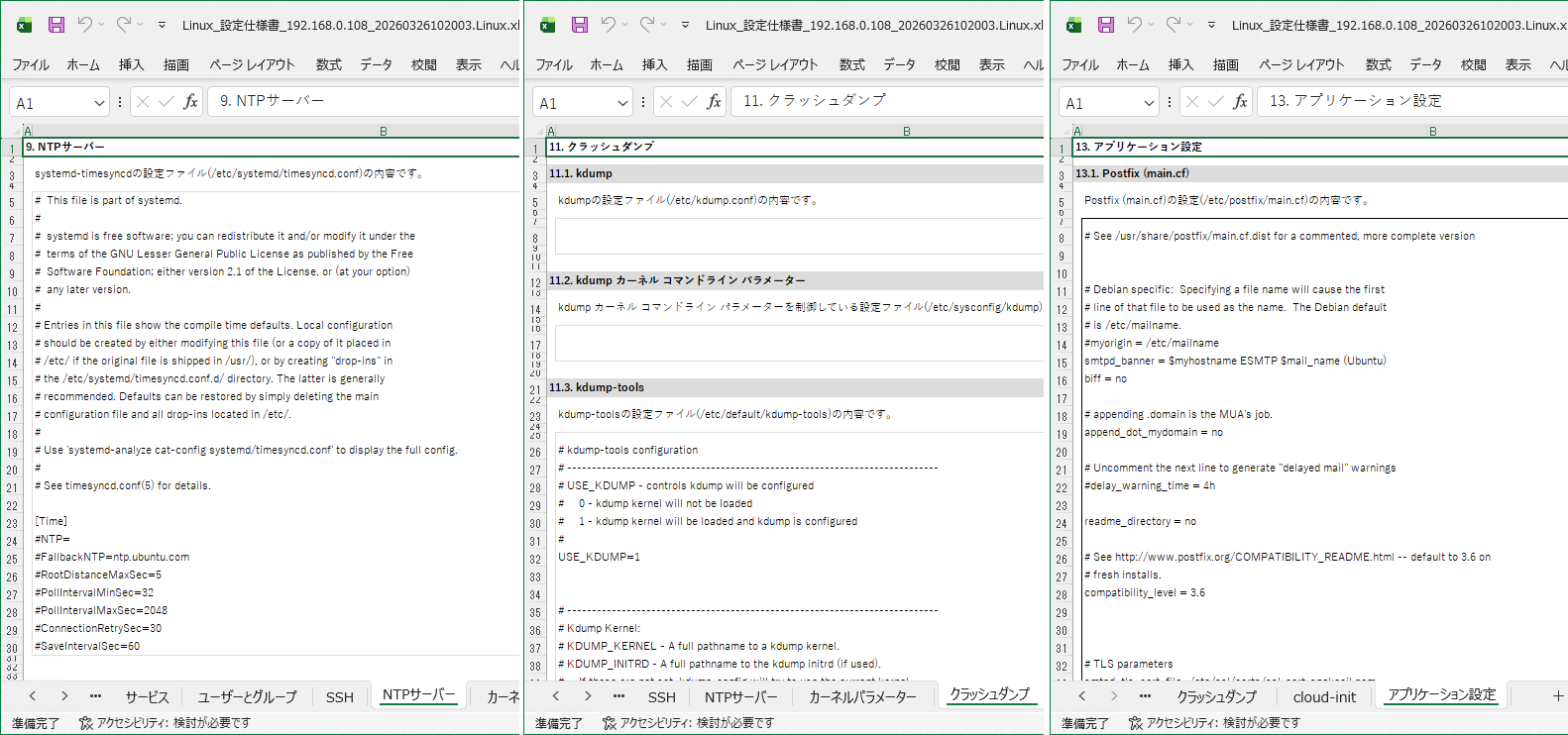 SSD-assistanceのLinux設定仕様書(Excelワークシート《.xlsx》)には、以下のシートが存在し、各シートに設定情報が出力されます。青色のシート名は2023年7月14日から、橙色のシート名は2026年3月13日から出力可能になったものです。