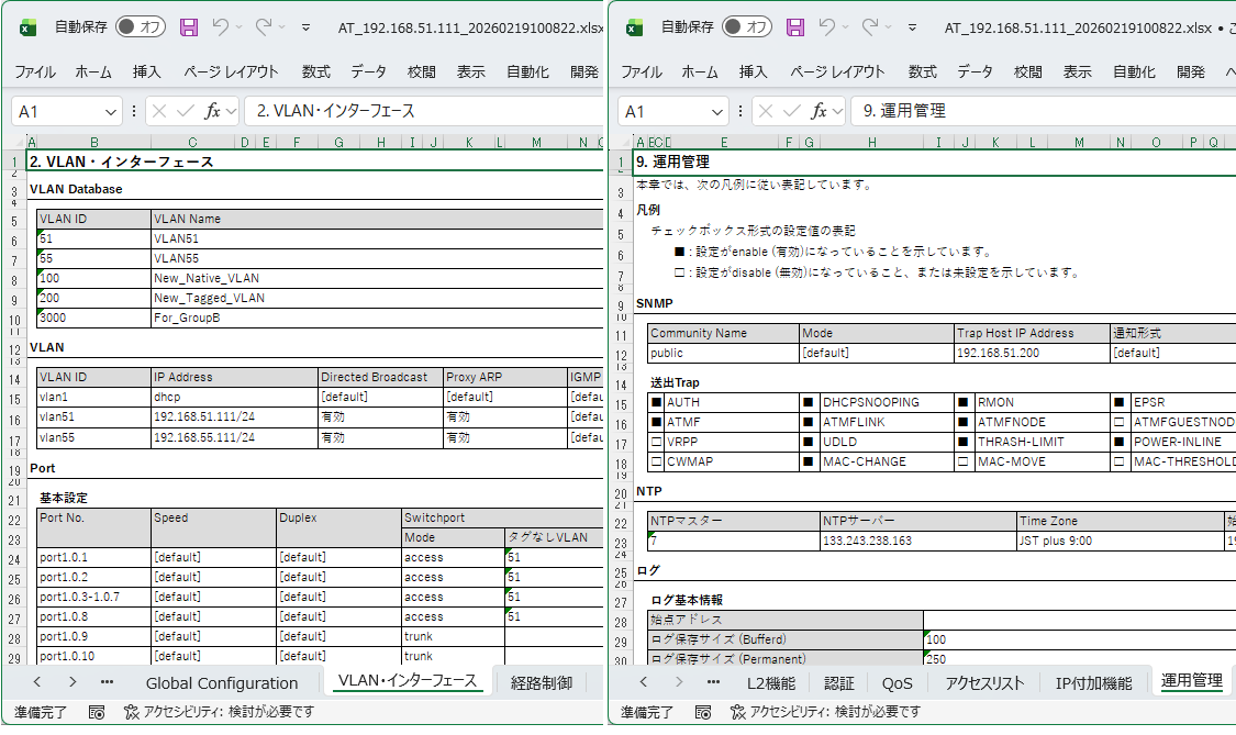 Allied Telesis スイッチ設定仕様書は、スイッチの設定情報をExcelワークシート形式(.xlsx) で出力します。Excelワークシートは以下のシートで構成され、設定情報を分類してドキュメント化します(画面1)。
