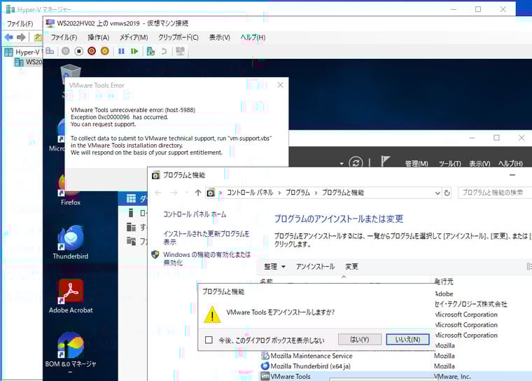 Hyper-V VMが起動すると、インストールされている場合、「VMware Tools」が回復不能なエラーを発生させるかもしれません。Hyper-V VMとして今後、運用するためには、VMware Toolsをアンインストールする必要があります。VMware Toolsのアンインストール方法は、通常のアプリケーションのアンインストール方法と同じで、コントロールパネルの「プログラムのアンインストールまたは変更」(appwiz.cpl)から実行できるのですが、VMware環境でないと正しくアンインストールできない場合があるようです。