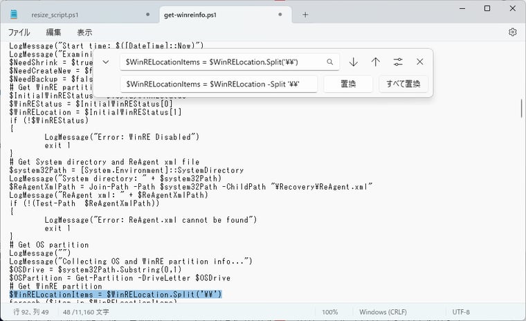 さらに、Windows PowerShell(powershell.exe)だけでなく、PowerShell(pwsh.exe)での実行も想定したエラー対策を2つ講じます。1つは、「$WinRELocationItems = $WinRELocation.Split('¥¥')」を「$WinRELocationItems = $WinRELocation -Split '¥¥'」(注:¥は半角)に置換することです(画面4)。もう1つは、「Get-WmiObject」を「Get-CimInstance」に置換することです。その必要性については、前回までのブログをご覧ください(画面5)。