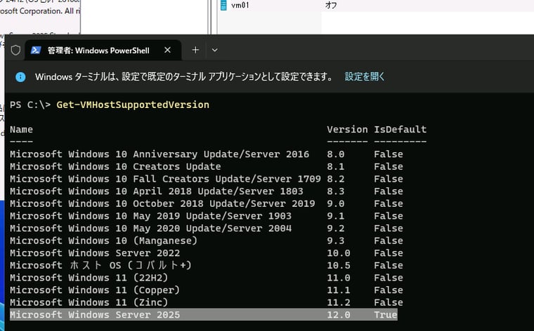 画面7 Windows Server 2025 Hyper-VのVMの既定の構成バージョンはWindows 11バージョン24H2と同じ「12.0」に。サポートされる構成バージョンはGet-VMHostSupportedVersionコマンドレットで確認できる
