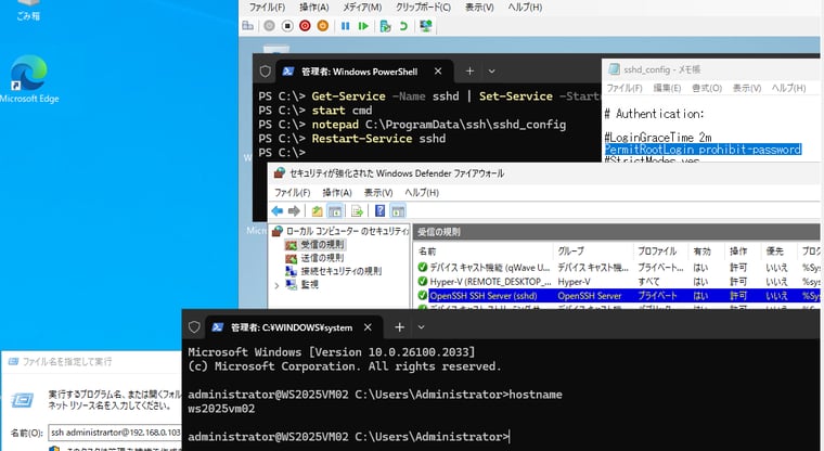 画面10 構成ファイル「sshd.config」で「PermitRootLogin prohibit-password」を有効にし、sshdサービスを再起動すると、リモートからAdministratorでパスワード認証による接続が可能に。ファイアウォールの「受信の規則」は既定で有効