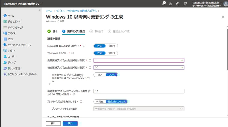 画面5 更新リングを作成し、旧WUfBの設定(延期期間やWindows 11アップグレード)を行う