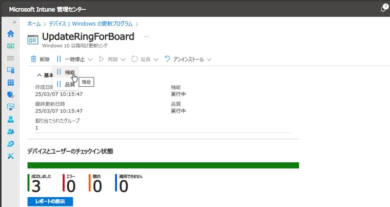 Entra参加デバイスを例に、従来の方法(旧WUfB)を使用したWindowsの更新プログラム管理について見てきました。運用環境では、延期期間の異なる複数の更新リングを使用して、まず小規模なデバイスグループに先行的に展開し、その結果を踏まえてより規模の大きいデバイスグループに展開するのが一般的です。更新リングを分けることで、先行の更新リングや、Microsoftの公開情報で機能更新プログラムや品質更新プログラムに重大な問題を確認したら、残りのデバイスへの展開を一時停止することができるからです(画面8)。管理者は「アンインストール」を実行して、更新リングでインストールされた更新プログラムをアンインストールしてデバイスの状態をロールバックすることもできます。なお、Windows 10/11 Enterprise E3またはE5のライセンスを持つ場合、Microsoft 365管理センター(https://admin.microsoft.