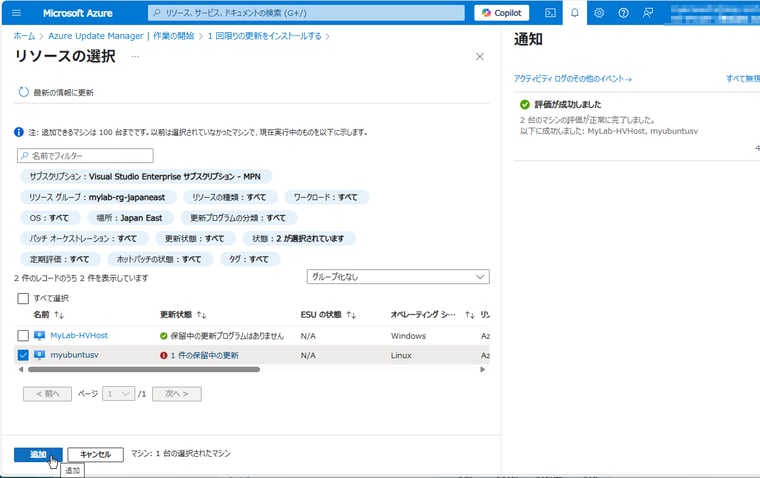 評価(更新プロラムの確認)が開始され、しばらくして完了すると「評価が成功しました」と通知されます。評価が完了したら、「作業の開始」ページの「オンデマンドの評価と更新」にある「マシンごとの更新プログラムのインストール」をクリックします。この操作は「概要」ページや「リソース|マシン」ページの上部にある「1回限りの更新」から開始することもできます。
