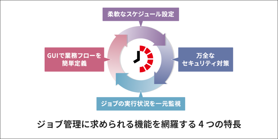 Job Director R16は、「GUI で業務フローを簡単定義」「柔軟なスケジュール設定」「万全なセキュリティ対策」「ジョブの実行状況を一元監視」といった 4 つの特長があります。